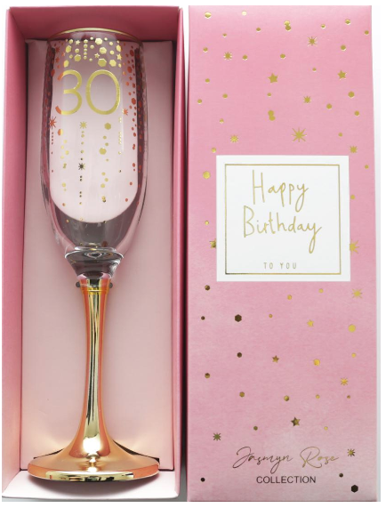 Introducing our exquisite Glass Champagne Flute, the perfect celebratory companion for a milestone birthday. This stunning piece features a gleaming metallic gold "30" at its center, complemented by a lustrous metallic gold stem that adds a touch of opulence and sophistication. Surrounding the age is an enchanting confetti pattern that adds a touch of whimsy and festivity. Crafted with precision and care, this glass exudes elegance and charm, making it a cherished keepsake for any special occasion. Each flute is meticulously presented in a stylish gift box, adding an extra layer of thoughtfulness to your gesture. Raise a toast in style and create lasting memories with this beautiful champagne glass. Cheers to a lifetime of cherished moments!