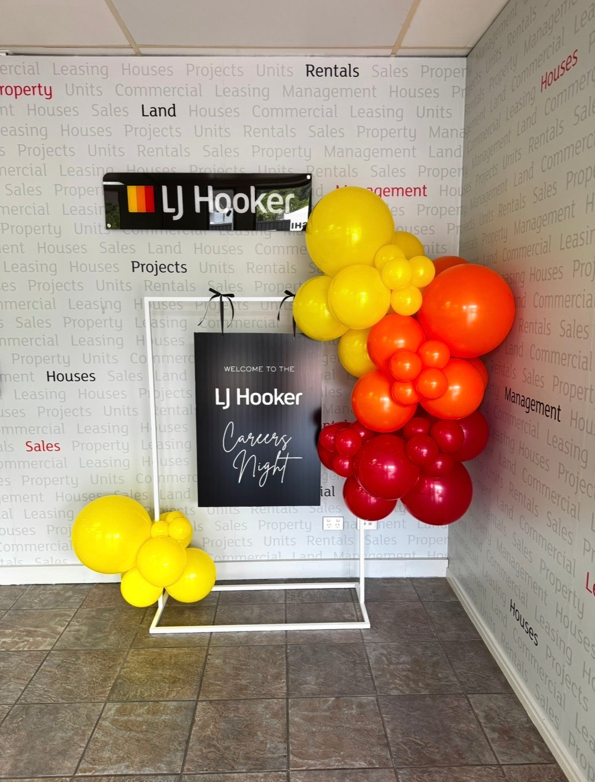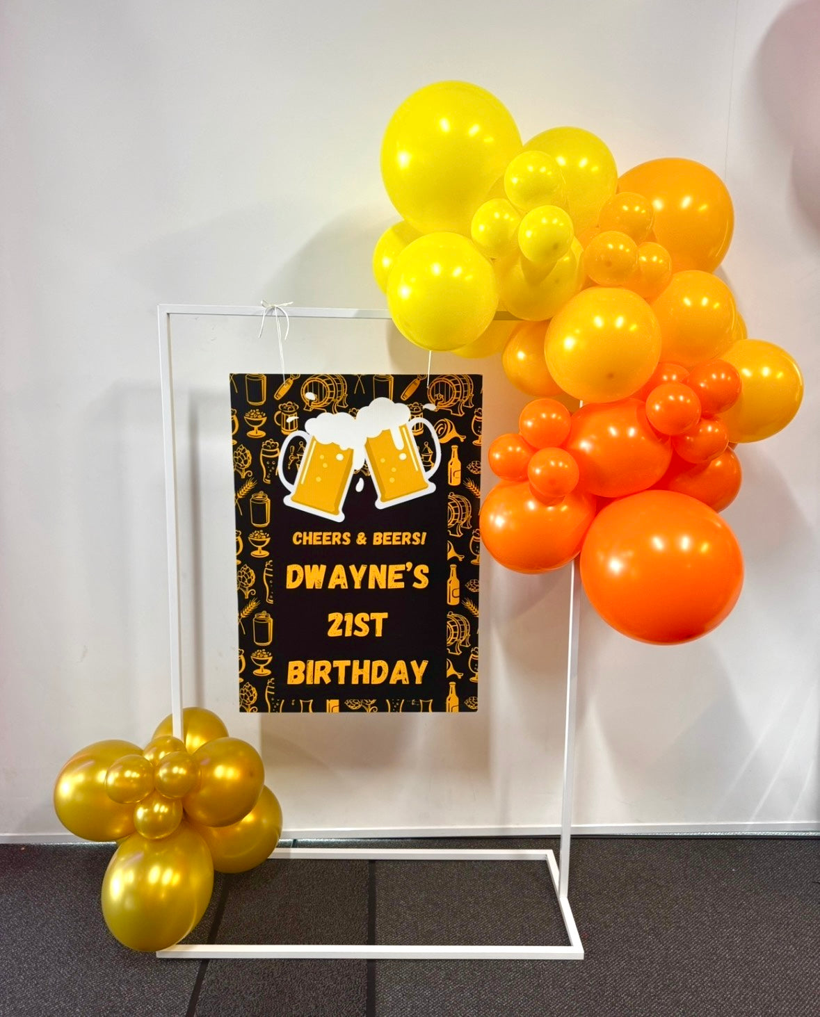 Our Floating Swing Sign showcases a custom hanging sign, paired with a stylish Balloon Garland, creating the perfect statement piece for entrances, photo moments and brand displays.